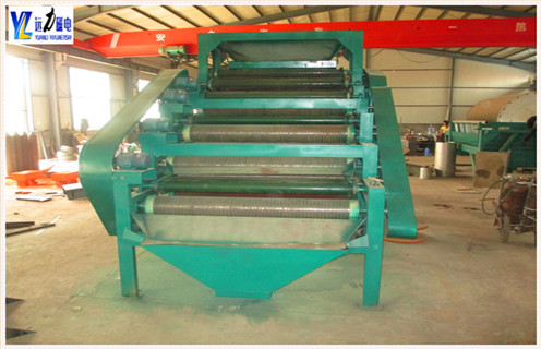 1、强磁辊式磁选机采用Q235或DT4材料制成的芯轴管,所述芯轴管上套装有磁环、铁环,所述磁环由钕铁硼材料制成,所述铁环由Q235材料制成,所述芯轴管两端分别螺装有将芯轴管两端封闭的轴头,所述轴头由不锈钢材料制成,所述轴头上螺装有用于将磁环和铁环压紧的螺母;所述磁环包括正极磁环和负极磁环,相邻两个铁环之间设有两个极性相反的磁环,且每个铁环两侧的磁环的极性相同。