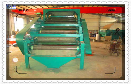 2、四辊锰矿磁选机是我公司新研制成功的磁分离设备。磁系全部采用高性能稀土钕铁硼材料和优质铁氧体材料制做,经过巧妙的开放式磁路设计,筒表分选区高磁感应强度达到0.8T以上,磁场强度是常规中磁机的3-5倍,分选区的磁场力可达到电磁登录入口的磁力水平。