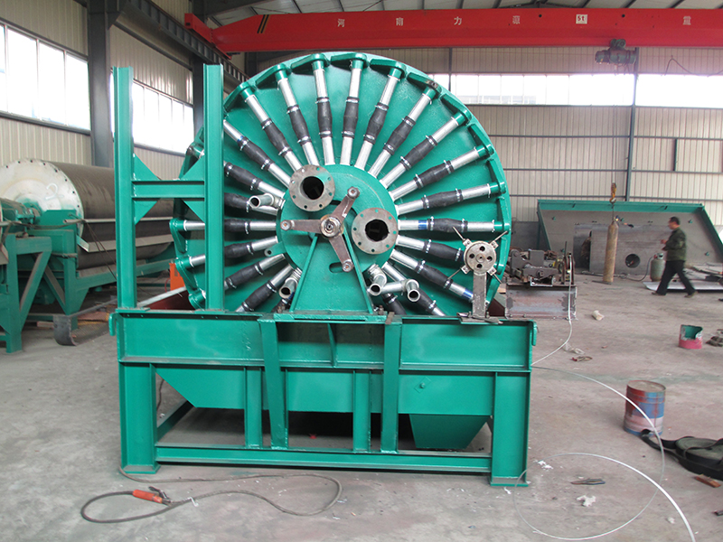 筒体内部装有锶铁氧体永久磁系,可促使磁性颗粒迅速吸附到滤布表面,由于是上部给料,使得滤饼中精矿按粒度分层的效果更加明显,当磁性精矿形成滤饼时,颗粒同时受到重力和磁力的作用,粗颗粒精矿比细颗粒精矿向滤布运动的快,精粒首先接触滤布,故滤饼的透气性好,而且矿浆中磁性颗粒在磁力吸引下呈放射状布于圆筒表面,并由于磁系极性变化而产生磁搅动作用,这都成为滤饼易脱水的有利条件,使得滤饼厚且透气性好,显著地提高了生产率,与同规格的筒形真空过滤机相比,其效率提高三倍以上。